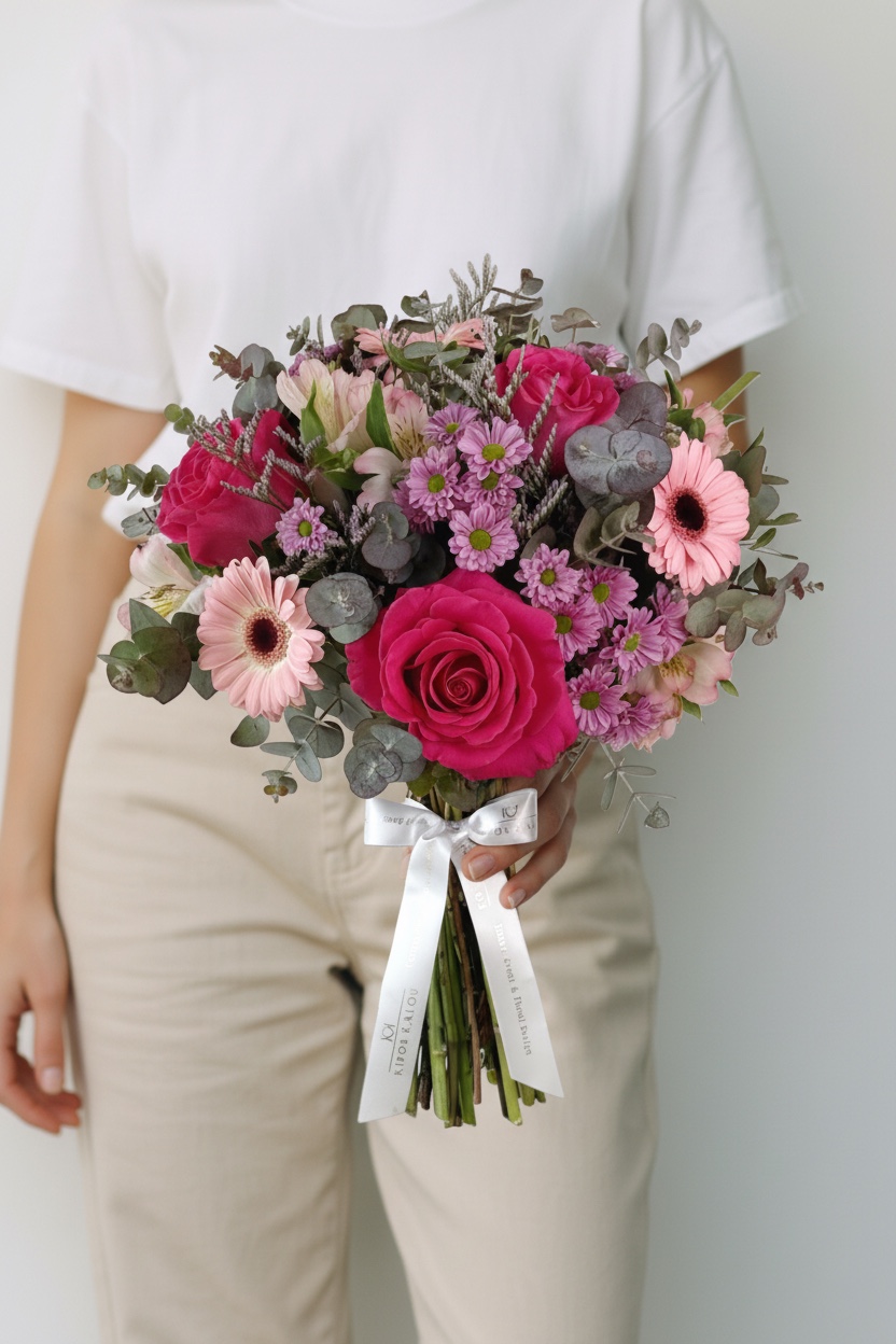 Bouquet with roses, gerberas, and seasonal flowers in pink and cherry shades.