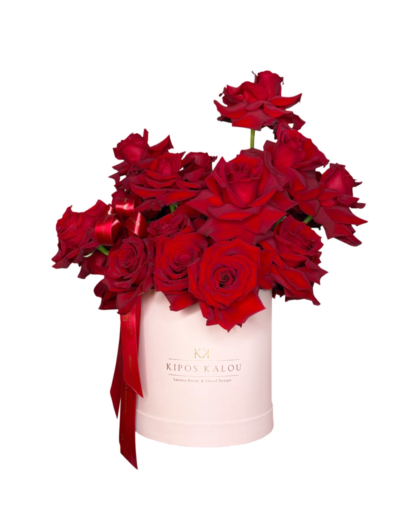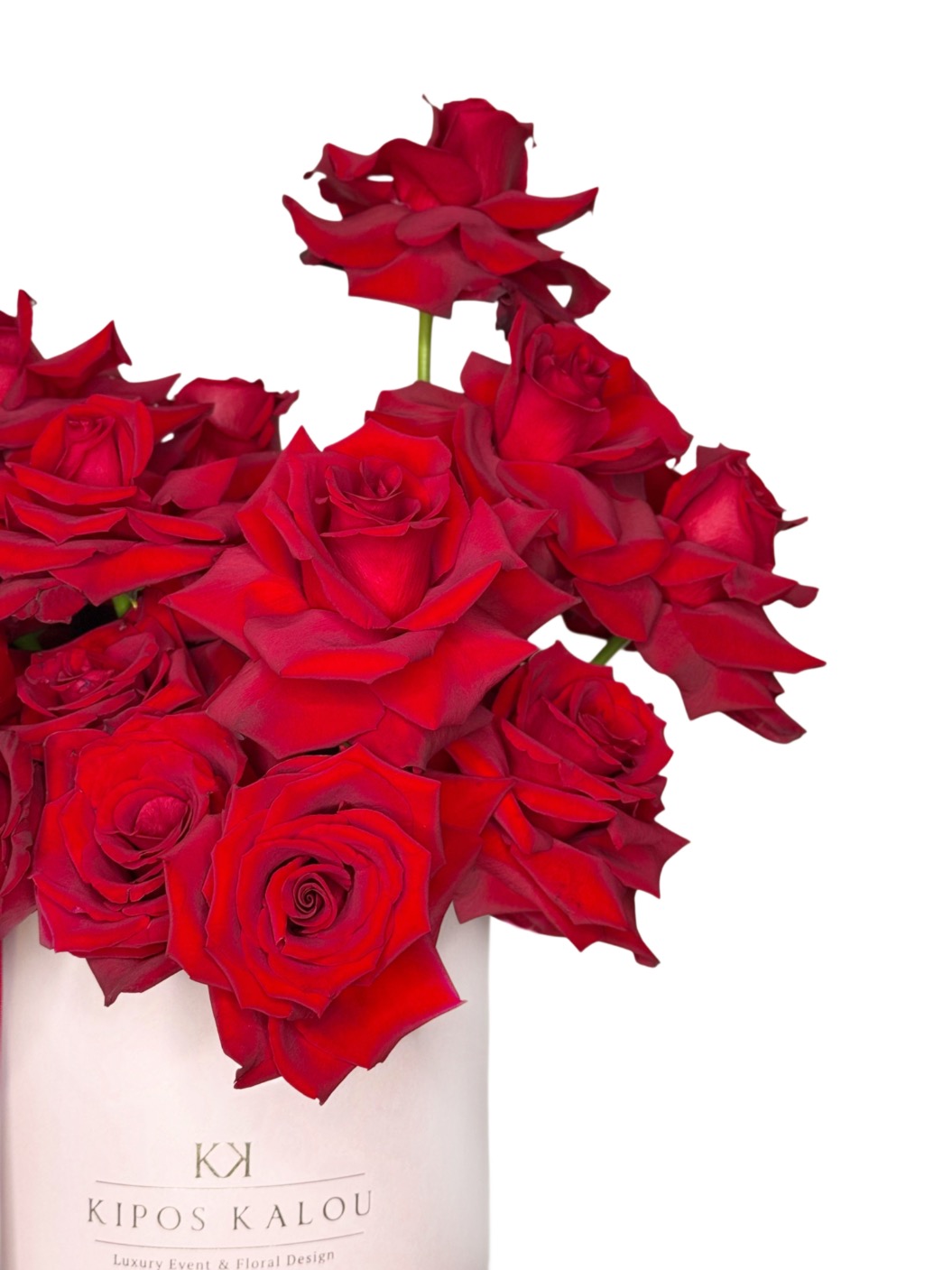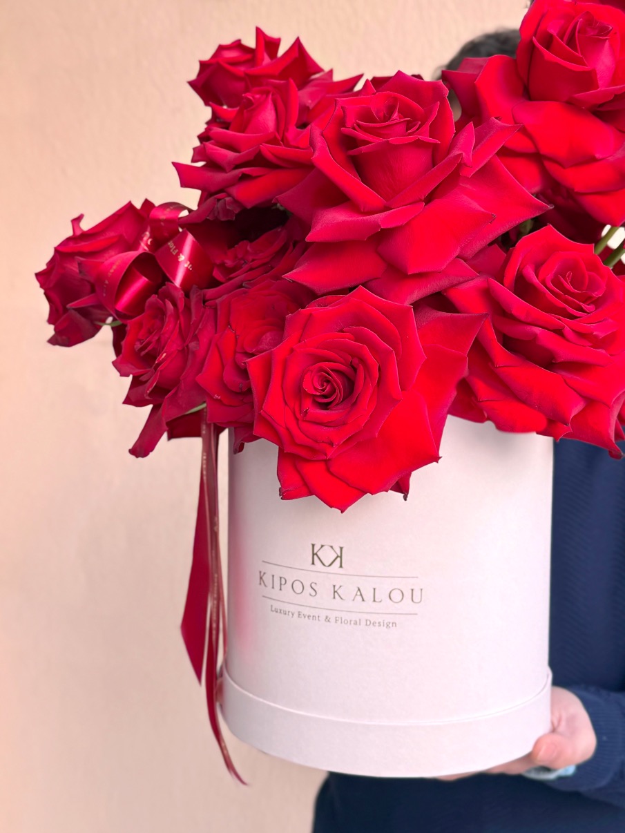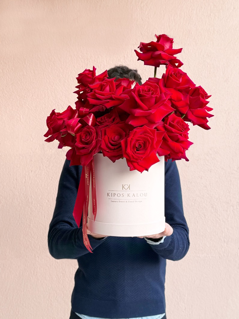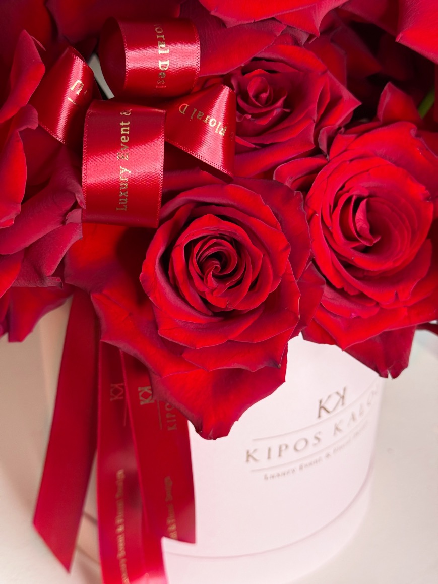 Stunning red roses from Ecuador arranged in a big round box. A modern and sophisticated gift proposal inspired by the celebration of love.