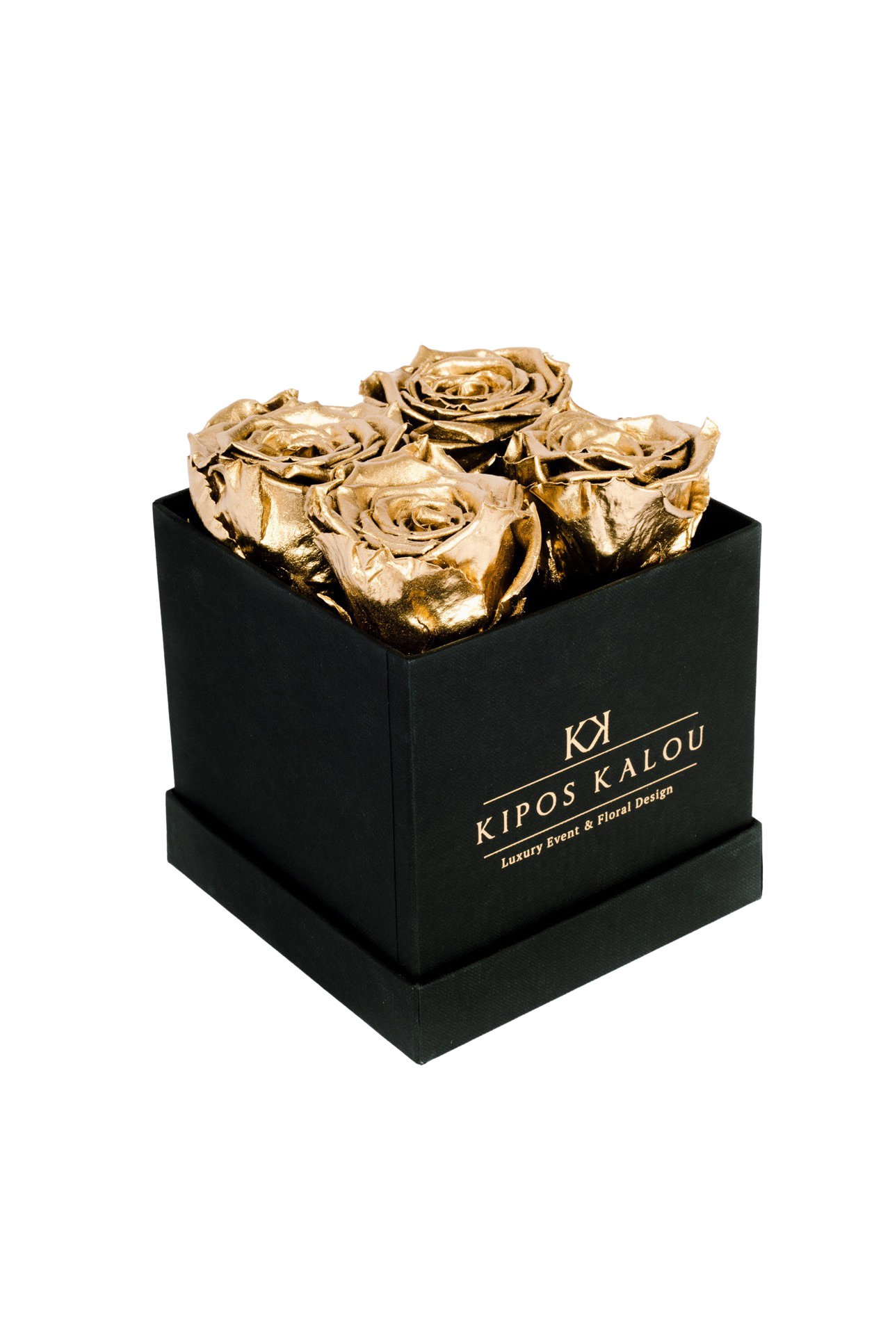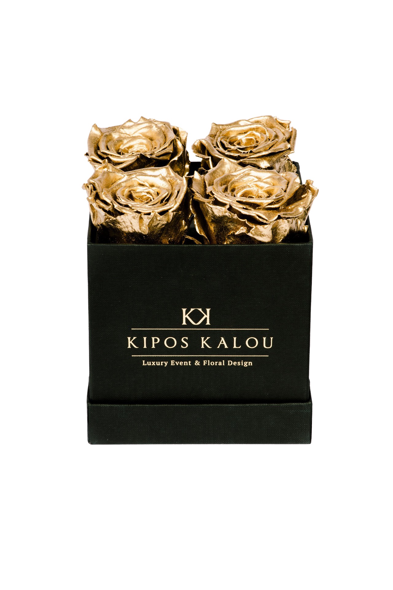 4 Gold XL Forever Roses in a black box. The gift packaging includes a luxury bag and a fabric ribbon. Experience true luxury with 100% real roses that last for 3 years! We select varieties from Ecuador for their excellent quality and wonderful texture.