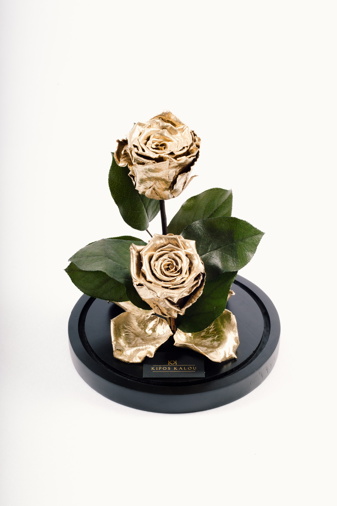 2 Gold XL Forever Roses in dome. The gift packaging includes a luxury bag and a fabric ribbon.