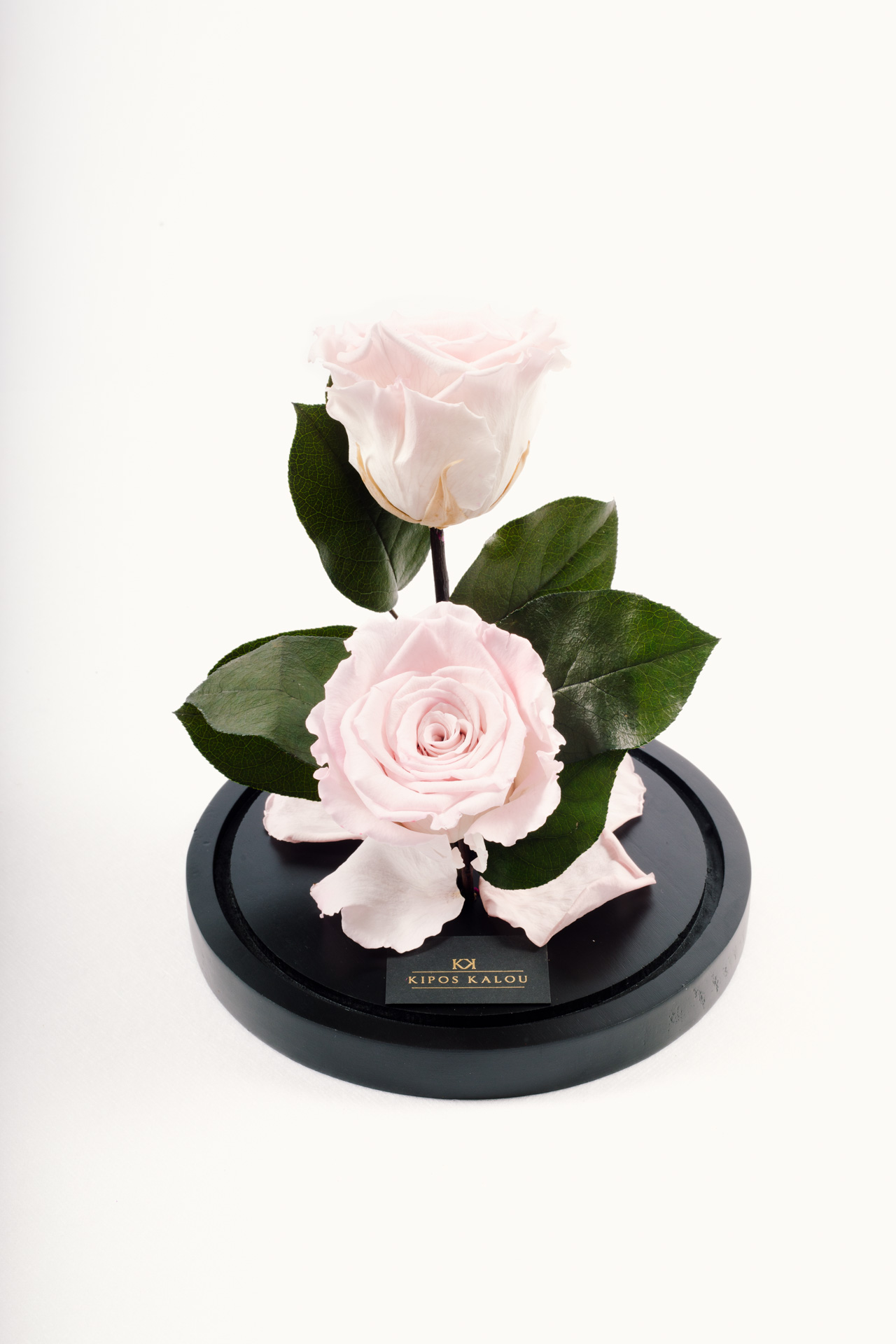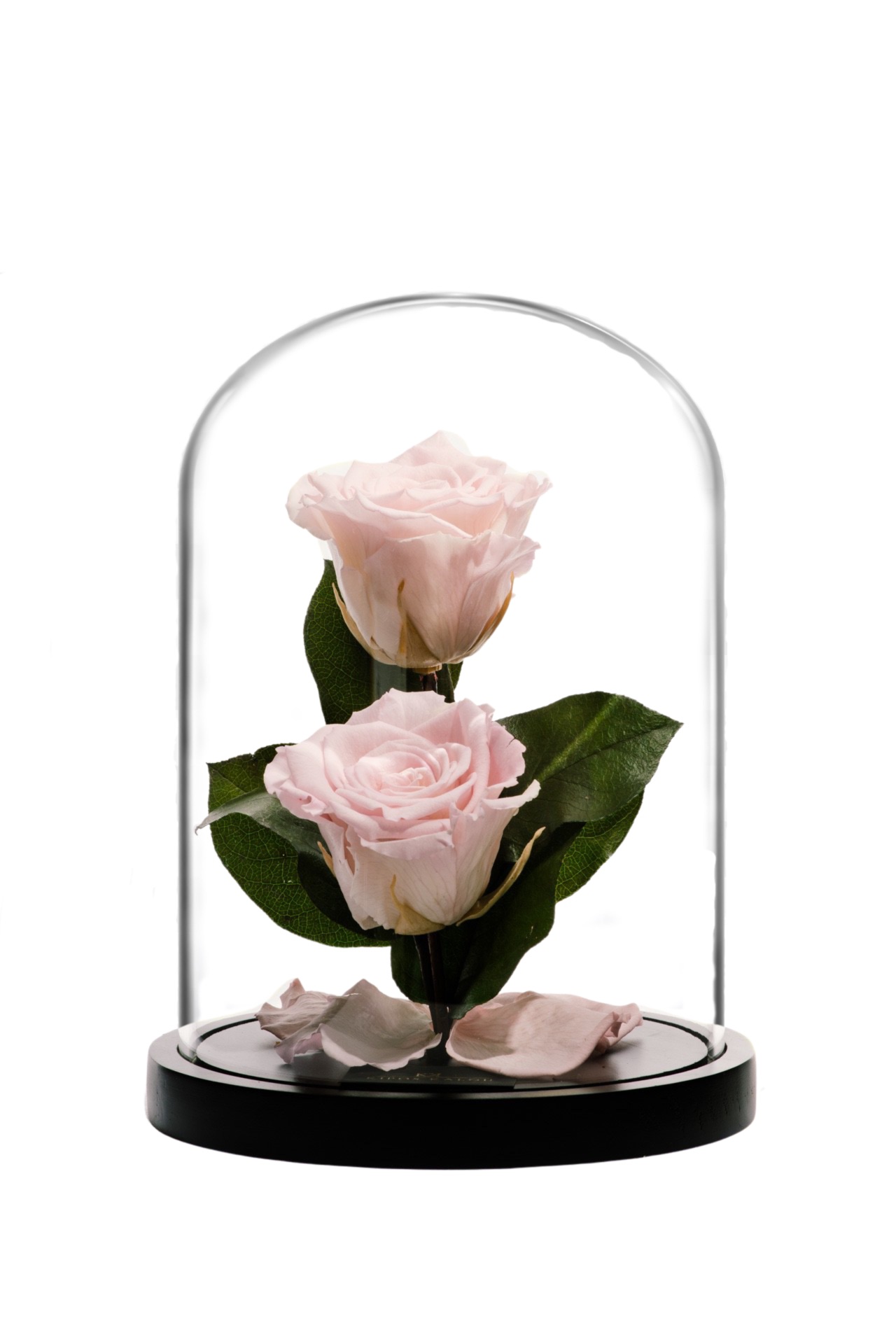 2 Pink XL Forever Roses in dome. The gift packaging includes a luxury bag and a fabric ribbon.