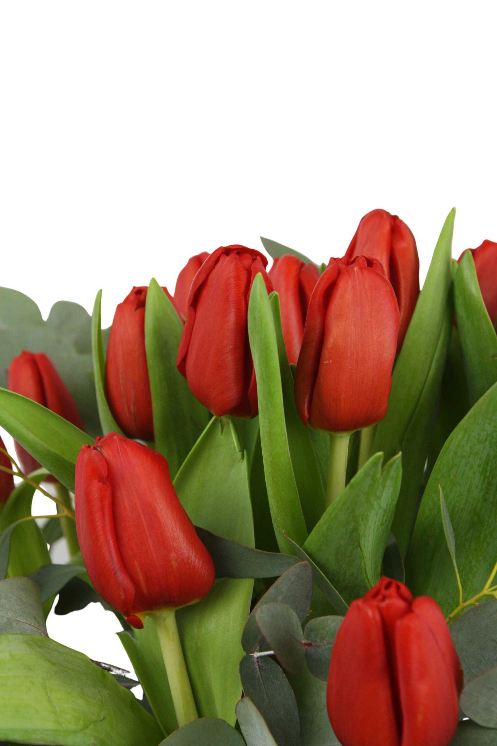 Bouquet with 21 red tulips.