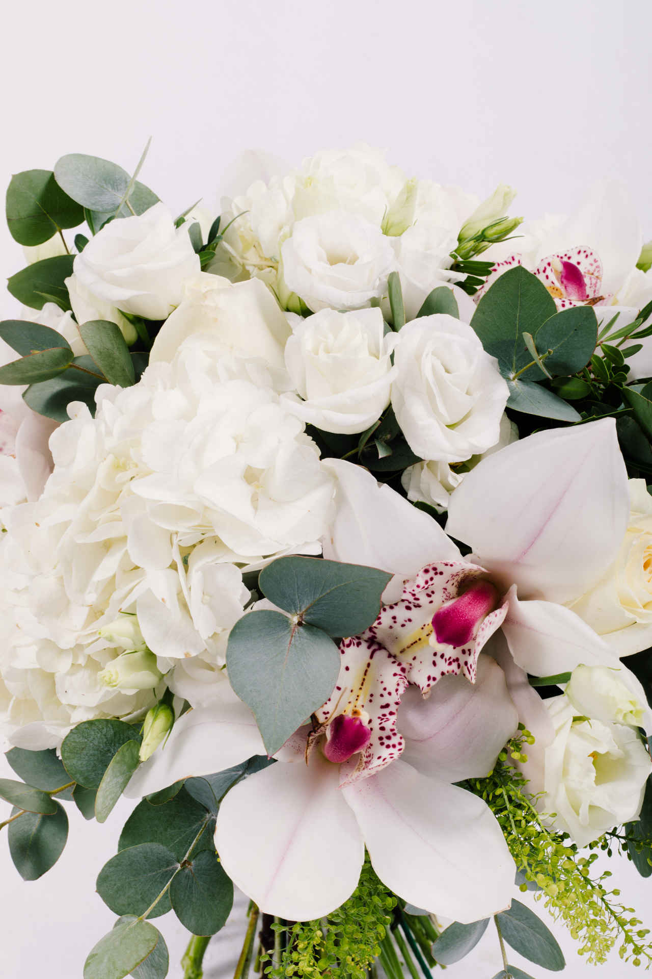 Bouquet with hydrangeas, orchids, and seasonal flowers in white shades.